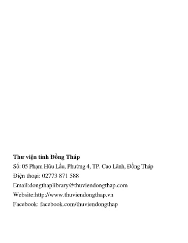 Thư viện tỉnh Đồng Tháp Số: 05 Phạm Hữu Lầu, Phường 4, TP. Cao Lãnh, Đồng Tháp Điện thoại: 02773 871 588 Email:dongthaplibrary@thuviendongthap.com Website:http://www.thuviendongthap.vn Facebook: facebook.com/thuviendongthap